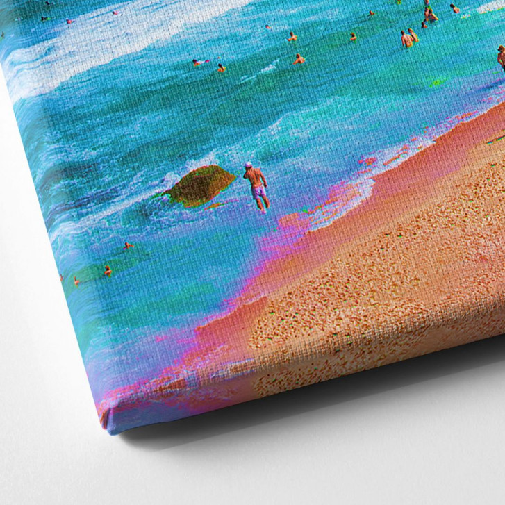 Schaffe mit dieser Wandkunst ein angenehmes Ambiente in deinem Zuhause! Sie ist eine ideale Mischung aus Ästhetik und Kreativität, die zum Entspannen und Geniessen einlädt. Der Kunstdruck von Nicebleed zeigt einen paradiesischen Strand, an dem viele Menschen bei schönem Wetter das Meer geniessen. Im Hintergrund sind Berge zu sehen. Dahinter befindet sich ein grosser bunter Kreis mit Glitch-Effekt, in dem „ERROR 404“ zu lesen ist. Eine Fehlermeldung – der Rest der Landschaft konnte nicht geladen werden.