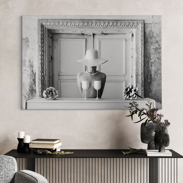 Dieser hochwertige Leinwanddruck bringt Ruslan Bolgovs atemberaubende Schwarz-Weiss-Fotografie in dein Zuhause. Die elegante Szene zeigt eine stilvolle Frau mit Hut und Perlenkette vor einer historischen Kulisse. Die raffinierte Komposition mit zwei perfekt positionierten Champagnergläsern erzeugt eine faszinierende optische Täuschung, die zum Nachdenken anregt.