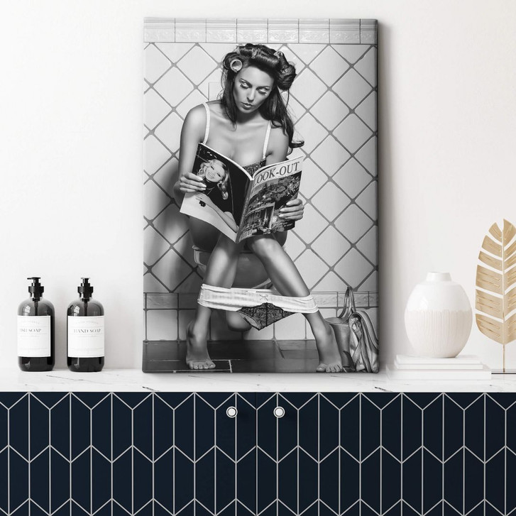 Das Badezimmer ist ein Ort der Diskretion und absoluten Privatsphäre. Es ist ein Zentrum für Gesundheit und Schönheit. Hier beginnt die morgendliche Routine. Das Badezimmer wird immer mehr zu einem Raum für Komfort und Gemütlichkeit. Vom Duschen und Zähneputzen über die Toilettenbenutzung bis hin zum Schminken und Schaumbad: Hier ist man ganz für sich allein und fühlt sich danach erfrischt, entspannt, frisch und schön. Das Foto des belgischen Fotografen Jeannot Magneto Stahl (kurz gNo) zeigt ein modernes Frauenporträt. Die hübsche Frau mit den Lockenwicklern sitzt auf der Toilette und vertieft sich in eine Zeitschrift. Unwiderstehlich weiblich und multitaskingfähig – ein perfektes Motiv für deine Lieblingsecke im Badezimmer.
