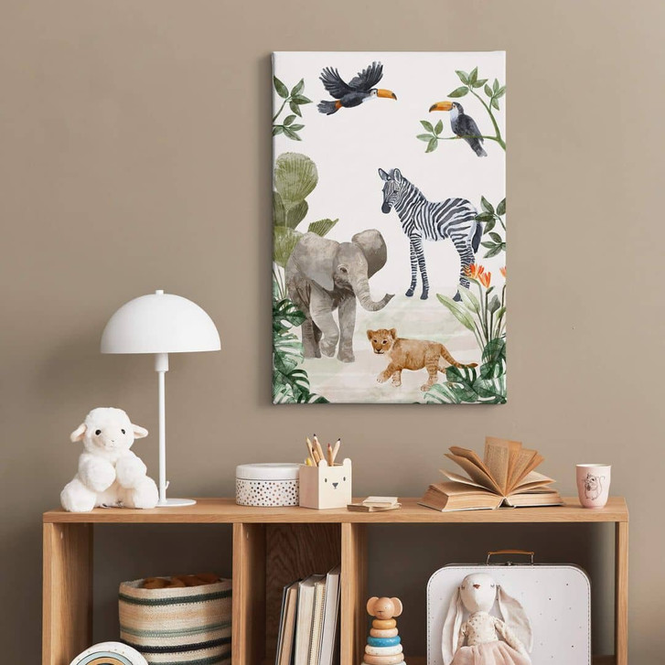 Die Gestaltung des Kinderzimmers ist wichtig für die Entwicklung eines Kindes. Hier spielen, toben und lernen Kinder den ganzen Tag. Mit dieser Dekoration verbringen Kinder gerne Zeit in ihrem Zimmer. Bringt mit dieser Illustration von Goed Blauw neue tierische Freunde in das Zimmer eures Kindes. Das Leinwandbild mit den Löwen-, Zebra- und Elefantenbabys wird der neue Blickfang an der Wand sein.