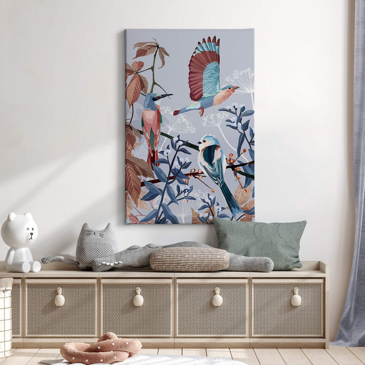 Warum nicht eine Auszeit nehmen und dem Stress entfliehen? Nirgendwo gelingt das besser als in den eigenen vier Wänden. Dieser Kunstdruck von Goed Blauw macht Lust auf die kalte Jahreszeit. Geniesse den Anblick der drei farbenfrohen Vögel im Baum.