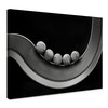 Das Schwarz-Weiss-Foto von fünf Holzkugeln, die in einer Reihe in einer leichten Kurve angeordnet sind, ist ein elegantes und stilvolles Kunstwerk der Fotokünstlerin Jacqueline Hammer. Das Motiv fängt die sanfte Dynamik perfekt ein und verbindet klassische Formen mit einer modernen Interpretation.