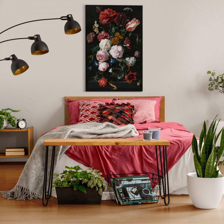 De Heem war der grösste Blumenmaler der holländischen Schule und konzentrierte sich auf das Stillleben von Blumen und Früchten. Das farbenfrohe Arrangement verschiedener Blumen ist stilvoll in einer Glasvase arrangiert. Die dekorativen Frühsommerblüher schmücken Ihre Wände in einem floralen Design und lassen das Ölgemälde aus dem 17. Jahrhundert wie neu erblühen!