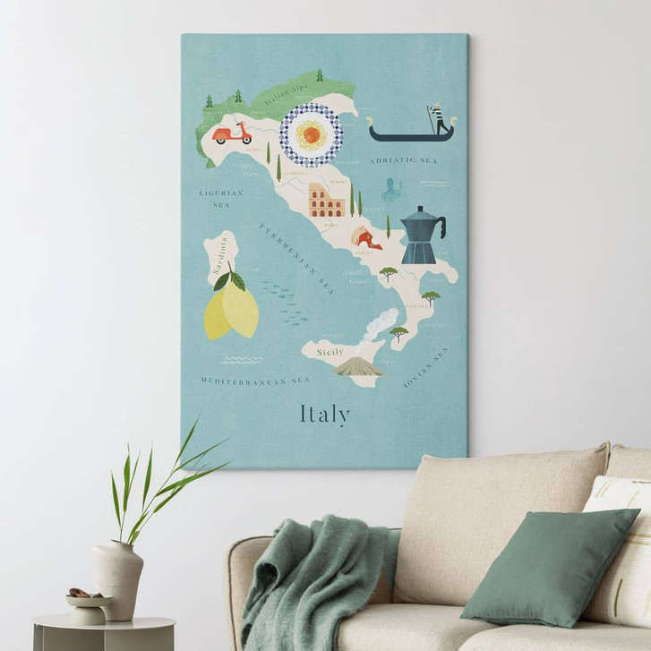 Entdecke Bella Italia von seiner schönsten Seite! Die illustrierte Landkarte von Henry Rivers entführt dich auf die Halbinsel, die mit wunderschönen Landschaften, historischer Architektur und kulinarischer Vielfalt aufwartet. Der italienische „Stiefel“ ist ideal für Liebhaber von Meeren und Küsten, denn er ist von der tyrrhenischen, adriatischen und ionischen Küste umgeben. Freuen Sie sich mit dem eindrucksvollen Leinwandbild auf Ihren nächsten Urlaub in Italien!