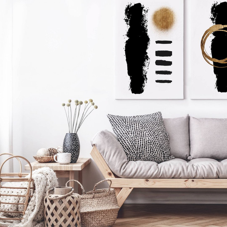Das Gemälde mit den schwarzen Streifen und dem goldenen Kreis zeigt den Kontrast zwischen Form und Farbe. Gestalte mit aussergewöhnlichen Motiven von Kubistika und lass dich von seiner modernen Kunst inspirieren!