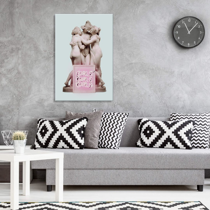 Entdecke Wohnaccessoires im zeitgenössischen Stil und verwöhne deine Augen mit diesem raffinierten Bild! Dieses ausgewählte Schmuckstück zaubert eine stilvolle Atmosphäre in den ganzen Raum. Und diese Fotokunst ist ein echter Hingucker! Die historischen Skulpturen und die Leuchtreklame „Girls Girls Girls“ sind eine gelungene Kombination zweier sehr unterschiedlicher Kunstformen und Epochen, die eine einzigartige Wanddekoration in deinem Zuhause ermöglichen. Darüber hinaus besticht der Leinwanddruck durch seine erstklassige Ästhetik, die nicht zuletzt durch die verwendeten Materialien und die mintfarbene Farbgebung unterstrichen wird. Unsere Leinwanddrucke auf Baumwoll-Canvas bieten besonders hochwertige Bilder mit gestochen scharfer Optik und grosser Leuchtkraft. Die Leinwände werden von Hand auf die Holzrahmen aufgezogen, sodass das stabile Bild jahrelang hält.