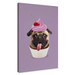 Auf den ersten Blick sieht man einen Muffin mit einer rosa Kappe und einer roten Kirsche obendrauf. Aber dies ist kein gewöhnlicher Muffin. Der Hauptteil des kleinen Kuchens ist ein Hundekopf, genauer gesagt ein Mops, der süss die Zunge herausstreckt. Mit dem Titel des Bildes „Pugcake“ spielt der Künstler mit dem Wort „Pug“ und dem Wort „Cupcake“, einer Art Muffin. Der Hintergrund ist in einem leuchtenden Violett gehalten. Im Allgemeinen ist dies ein amüsantes und gleichzeitig verspieltes Motiv für jeden Mopsliebhaber!