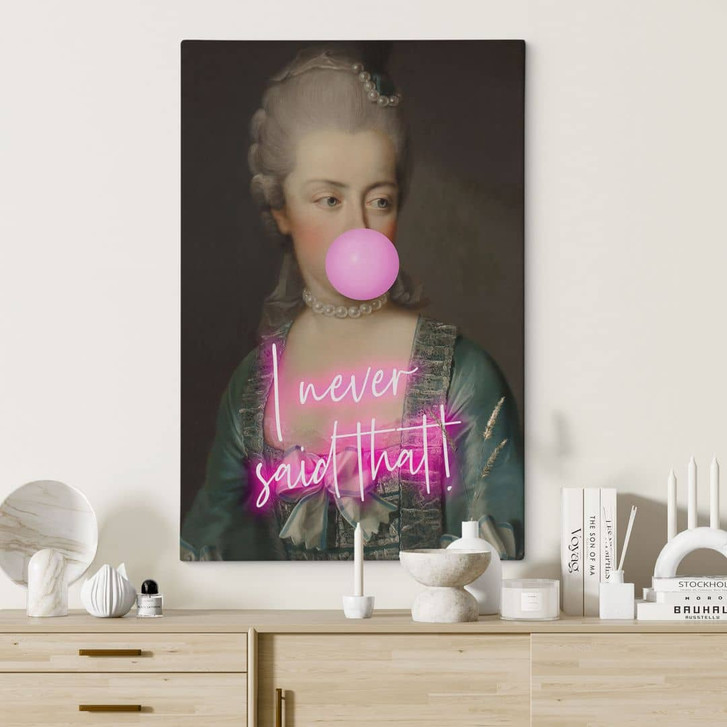 Dieses Leinwandbild verbindet klassische Malerei und moderne Popkultur in einer einzigartigen Interpretation. Das Bild basiert auf dem Originalporträt von Joseph Hickel und wurde mit einer pinkfarbenen Blase und der neonbeleuchteten Aufschrift „I never said that!“ (Ich habe das nie gesagt!) ergänzt, was dem Werk eine humorvolle und zeitgemässe Note verleiht. Diese kreative Mischung aus Tradition und Moderne macht das Kunstwerk zu einem echten Hingucker, der in jedem Raum für Gesprächsstoff sorgt.