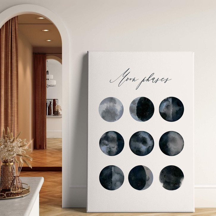 Der magische Mond ist hier in neun verschiedenen Phasen zu sehen. Sie beeinflussen nicht nur die Gezeiten, sondern auch uns Menschen. Von Neumond über Vollmond bis hin zu abnehmendem Mond: Jede einzelne Phase hat eine andere Wirkung auf Mensch und Natur. Das spirituelle Motiv ist in verschiedenen Materialien erhältlich. Neben seiner ausdrucksstarken Darstellung überzeugt das Leinwandbild im Hochformat durch hochwertige Materialien und satte Farben. Zusammen mit den einzelnen Komponenten entsteht eine eindrucksvolle Wanddekoration.