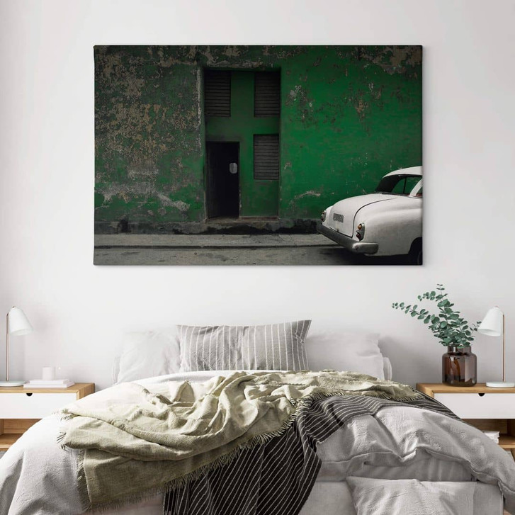 Verwandle deinen Wohnbereich in einen beruhigenden Ort, an dem du es dir mit unseren zeitgenössischen Motiven gemütlich machen kannst. Die Vintage-Fotokunst der Fotografin Inge Schuster zeigt ein Stück der Karibikinsel Kuba. Das Haus ist in einer grünen Farbe gestrichen, die langsam abbröckelt. Auf der Strasse ist ein Teil eines weissen Autos zu sehen.