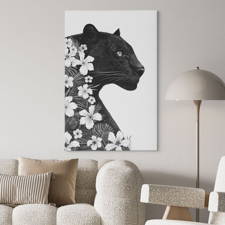 Das Leinwandbild von Valeriya Korenkova zeigt die majestätische Silhouette eines schwarzen Panthers, umgeben von zarten weissen Blumen. Dieses atemberaubende Kunstwerk verbindet die rohe Kraft des Tieres mit der zarten Schönheit der Natur und erzählt eine Geschichte von Anmut und Stärke. Der intensive Blick des Panthers fesselt den Betrachter, während die floralen Details für ein beruhigendes Gleichgewicht sorgen.