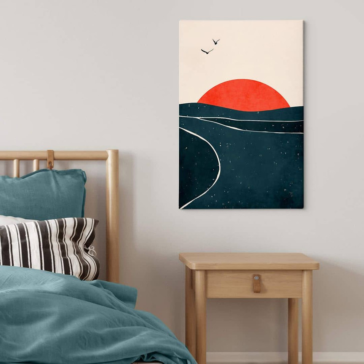 Hast du deinen eigenen individuellen Stil? Mit unserem Wandbild kannst du ihn gekonnt in Szene setzen. Verleihe deinem Wohnbereich eine einzigartige Atmosphäre. Der Kunstdruck von Kubistika zeigt einen romantischen Sonnenuntergang über dem blauen Meer. Zwei Tauben fliegen über die rote Sonne.