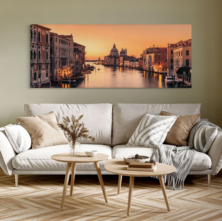 Dieses Kunstwerk ist die perfekte Wahl für alle, die ihren Wohnraum mit einem Hauch italienischer Eleganz und zeitloser Schönheit bereichern möchten. Ob im Wohnzimmer, Schlafzimmer oder Büro – das Leinwandbild im Panoramaformat „Sonnenuntergang in Venedig“ setzt in jedem Raum einen stilvollen Akzent.