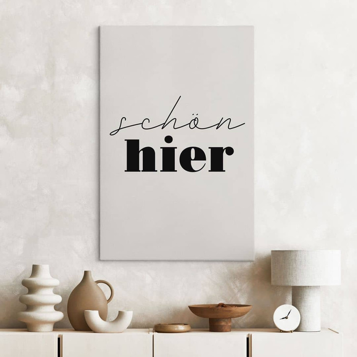 Suchst du nach Inspiration, um dein Zuhause neu zu dekorieren? Dieses Wandbild verleiht dir einen neuen, frischen Look! „Schön hier“ (Nice to be here) ist ein passender Spruch für das Wohnzimmer, der dich jeden Tag daran erinnert, wie schön es ist, in deinem eigenen Zuhause zu sein. Mit dem schwarzen Schriftzug als Leinwandbild wirst du dich auch zu Hause gleich wohlfühlen.