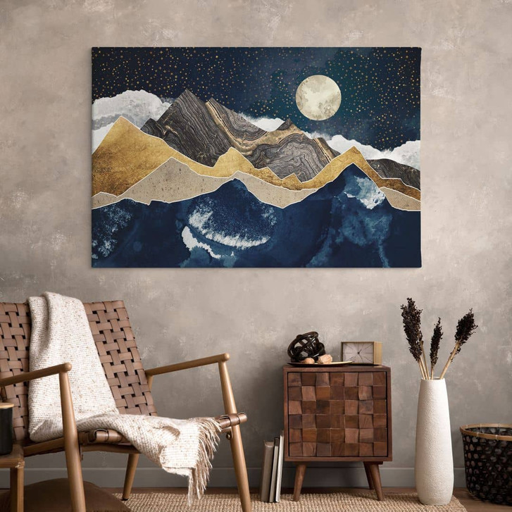 Verpasse deinen Wänden ein bezauberndes Outfit – mit dieser Wanddekoration triffst du eine stilvolle Wahl. Wenn du dich nach Natur, Landschaften und Bergen sehnst, ist der Kunstdruck von SpaceFrog Designs perfekt für dich. Dieses Landschaftsmotiv zeigt eine Bergkette in verschiedenen Erdtönen. Durch den Hell-Dunkel-Kontrast ist jeder Berg deutlich zu erkennen. Ausserdem betonen die dunkelblauen Farben wunderbar die nächtliche Stimmung und Ruhe. Lass dich vom Vollmond und den Sternen in eine romantische Berglandschaft entführen!