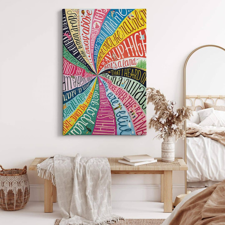 Somewhere over the rainbow ist eines der berühmtesten Lieder der Welt. Das Lied, das vielen Menschen Kraft gibt, ist zu einem erfolgreichen Evergreen geworden. Die sanfte Melodie und der ermutigende Text wecken die Hoffnung auf eine bessere Zeit. Wir alle kennen das Gefühl der Hoffnung, das dieses Lied nur allzu gut vermittelt. Beginne den Tag heute mit einer positiven Note – das farbenfrohe Werk auf Leinwand wirkt motivierend und hoffnungsvoll.