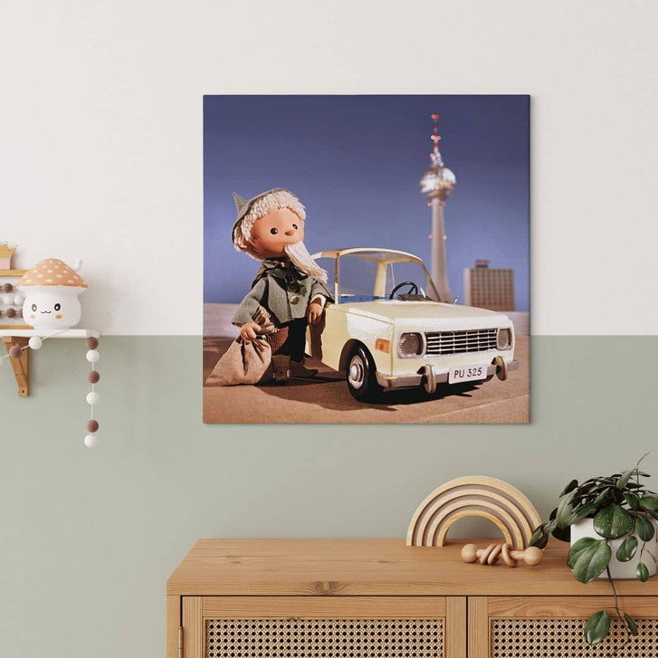 Die Kinderserie „Unser Sandmännchen“ läuft seit 1959 im deutschen Fernsehen und ist seitdem nicht mehr wegzudenken. Der kleine Mann ist eine Erfindung aus DDR-Zeiten und erobert bis heute Kinderherzen. Sandmanns täglicher Abendgruss zur Schlafenszeit wurde zum festen Ritual. Der Sandmann mit seinem Traumsand hat längst Kultstatus erreicht und ist immer noch ein gern gesehener Freund in Kinderzimmern. Das Leinwandbild zeigt den Sandmann mit seinem Trabi. Er reiste nach Berlin, zum Alexanderplatz mit dem Fernsehturm.