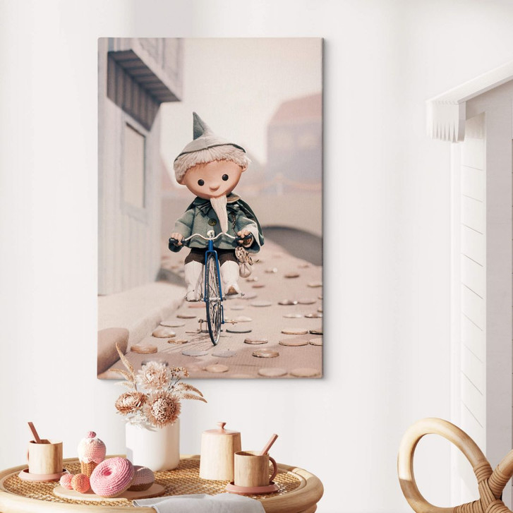 Seit 1959 läuft die Kinderserie „Unser Sandmännchen“ im deutschen Fernsehen und ist seitdem nicht mehr wegzudenken. Der kleine Mann ist eine Erfindung aus DDR-Zeiten und erobert auch heute noch die Kinderherzen. Sein täglicher Abendgruss kurz vor dem Schlafengehen ist zu einem festen Ritual geworden. Der Sandmann mit seinem Traumsand hat längst Kultstatus erreicht und ist nach wie vor ein gern gesehener Freund in Kinderzimmern. Das Leinwandbild mit nostalgischem Flair zeigt den Sandmann mit seiner markanten Mütze auf einem Fahrrad.