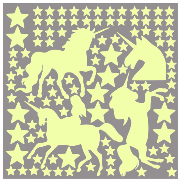 Das bezaubernd leuchtende Einhorn-Set verwandelt jedes Mädchenzimmer in eine fantastische Traumwelt voller Sterne und Einhörner. Die fluoreszierenden Einhörner und Sterne werden durch Lichteinfall aufgeladen und leuchten im Dunkeln. Die einzelnen Leuchtaufkleber lassen sich leicht vom Bogen abziehen und beliebig an der Wand platzieren.