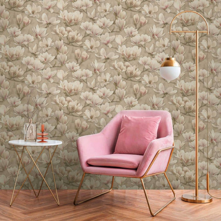 Magnolien-Tapete Beige Rosa – Florale Mustertapete mit Blumen – Vliestapete