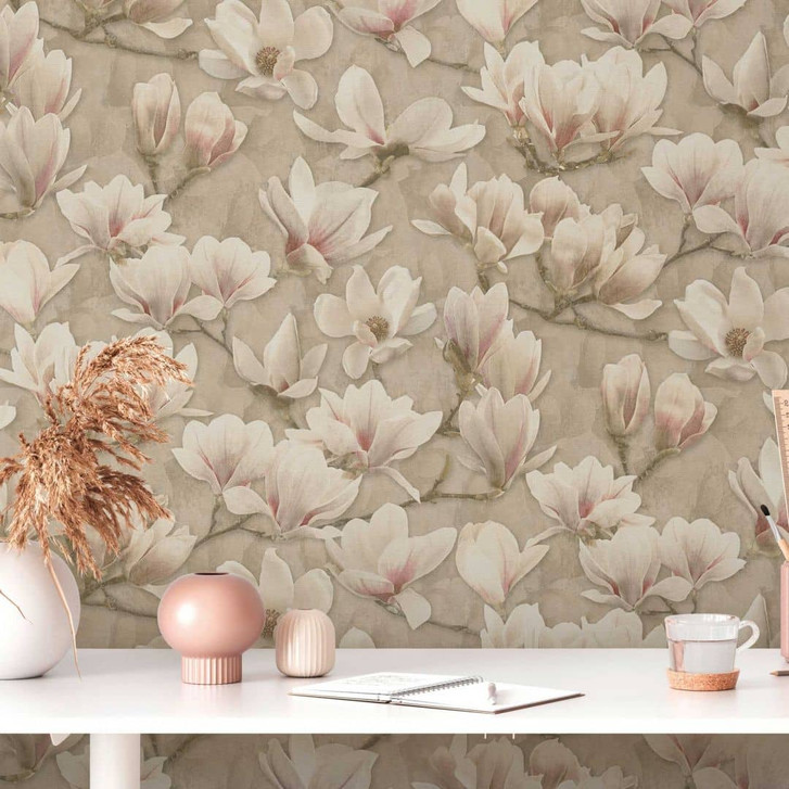 Magnolien-Tapete Beige Rosa – Florale Mustertapete mit Blumen – Vliestapete