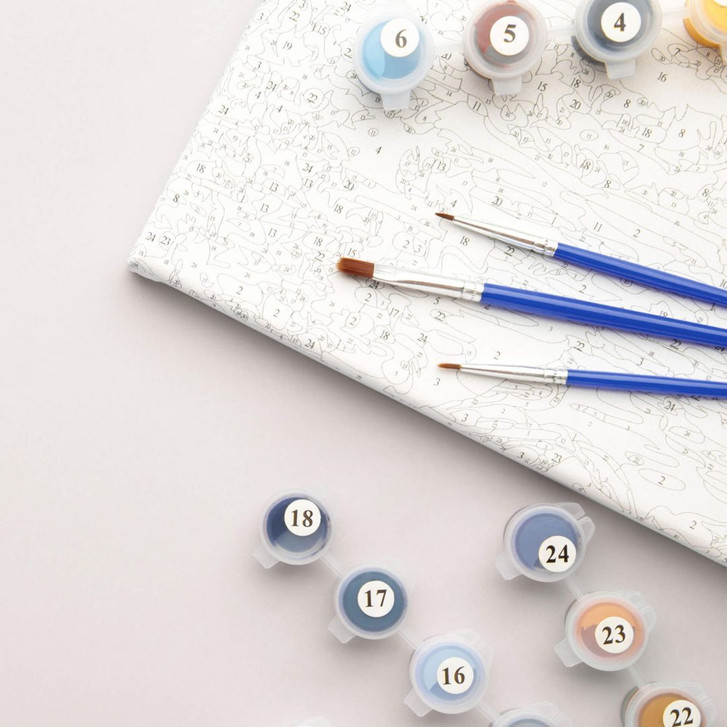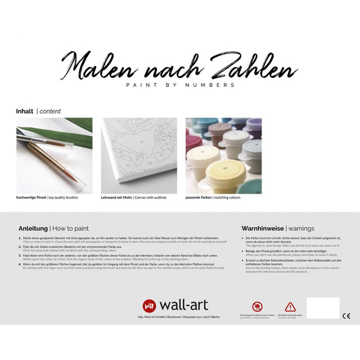 Mit den mitgelieferten Acrylfarben und Pinseln kannst du sofort mit dem Malen beginnen. Die Leinwand und die dazugehörigen Farbtöpfchen sind mit Zahlen versehen, um dir die Auswahl der richtigen Farbe zu erleichtern. Die Leinwand ist auf einen Holzkeilrahmen gespannt, sodass sie nach der Fertigstellung sofort aufgehängt werden kann.