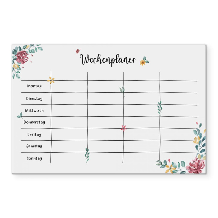 Der transparente Wochenplaner ist als Glas- oder Acrylglasbild und in verschiedenen Grössen erhältlich. Als Zusatzprodukte können Stifte zum Beschriften und eine Klammer zur Wandbefestigung bestellt werden.
