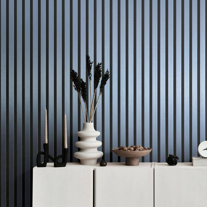 Metallic-Blaue Vliestapete mit Schwarz Skandinavische Akustik-Holzpaneel Optik Luxus-Tapete