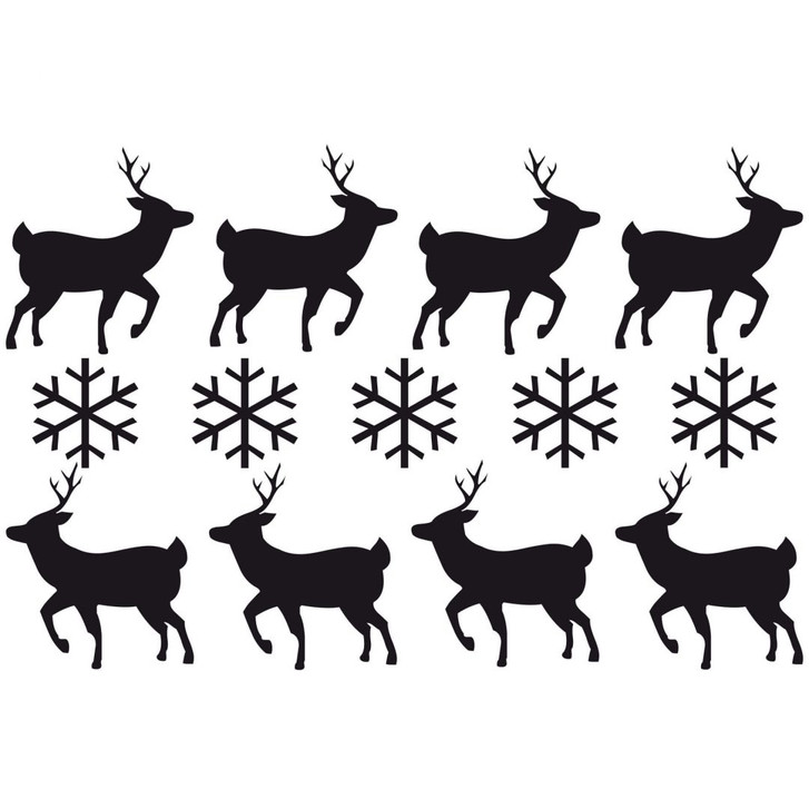 Das Set besteht aus 8 Hirschen und 5 milchigen Fensterfolien-Schneeflocken.