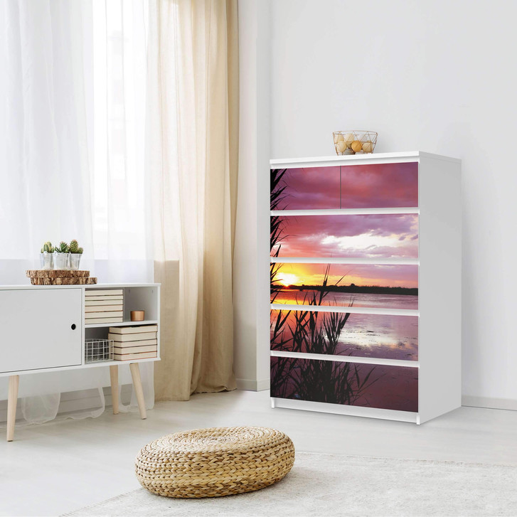 Unsere Möbel Klebefolie Dream away für die Malm Kommode 6 Schubladen (hoch) ist der Blickfang in jedem Schlafzimmer. Die Dekofolien sind hochwertige, selbsthaftende Vinylfolien (seidenmatt) und können dank Bubble-free Technologie kinderleicht verklebt werden.