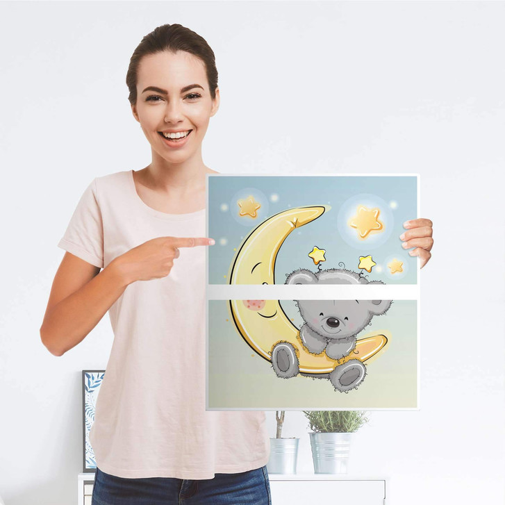 Unsere Selbstklebende Folie Teddy und Mond für die Hemnes Kommode 2 Schubladen ist der Blickfang in jedem Kinderzimmer. Die Dekofolien sind hochwertige, selbsthaftende Vinylfolien (seidenmatt) und können dank Bubble-free Technologie kinderleicht verklebt werden.