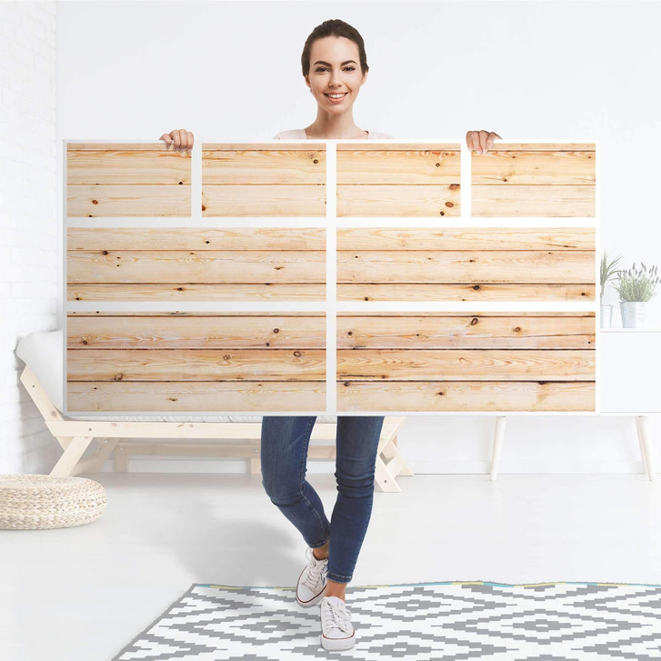 Unsere Möbelfolie Bright Planks für die Hemnes Kommode 8 Schubladen ist der Blickfang in jedem Wohnzimmer. Die Dekofolien sind hochwertige, selbsthaftende Vinylfolien (seidenmatt) und können dank Bubble-free Technologie kinderleicht verklebt werden.