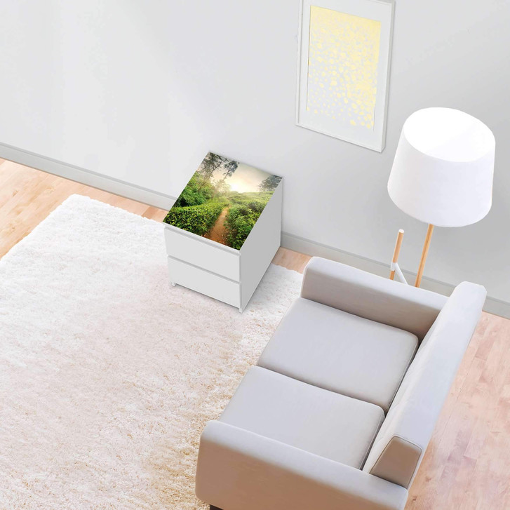 Unsere Möbelfolie Green Tea Fields für die Malm Kommode 2 Schubladen oben ist der Blickfang in jedem Schlafzimmer. Die Dekofolien sind hochwertige, selbsthaftende Vinylfolien (seidenmatt) und können dank Bubble-free Technologie kinderleicht verklebt werden.