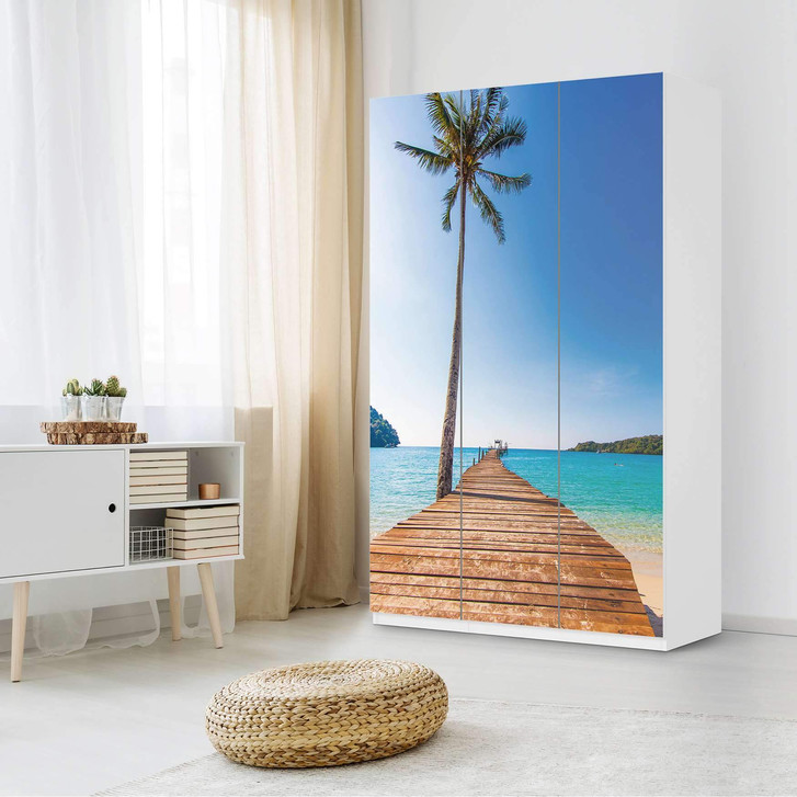 Unsere Selbstklebende Folie Caribbean ist passend zugeschnitten für den Pax Schrank 236cm Höhe - 3 Türen und ist der Blickfang in jedem Schlafzimmer. Die Dekofolien sind hochwertige, selbsthaftende Vinylfolien (seidenmatt) und können dank Bubble-free Technologie kinderleicht verklebt werden.