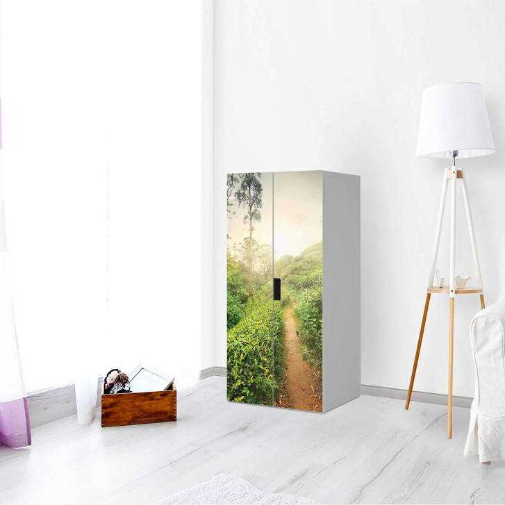 Unsere Möbelfolie Green Tea Fields für den Stuva Schrank - 2 grosse Türen ist der Blickfang im Wohnzimmer. Unsere Dekofolien sind hochwertige, selbsthaftende Vinylfolien (seidenmatt) und können dank Bubble-free Technologie kinderleicht verklebt werden.