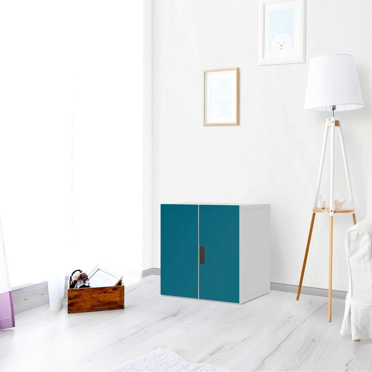Unsere Selbstklebende Folie Türkisgrün Dark für den Stuva Schrank - 2 kleine Türen ist der Blickfang im Wohnzimmer. Unsere Dekofolien sind hochwertige, selbsthaftende Vinylfolien (seidenmatt) und können dank Bubble-free Technologie kinderleicht verklebt werden.