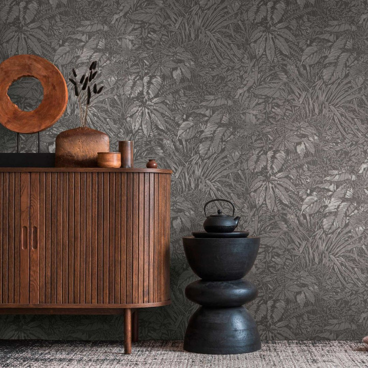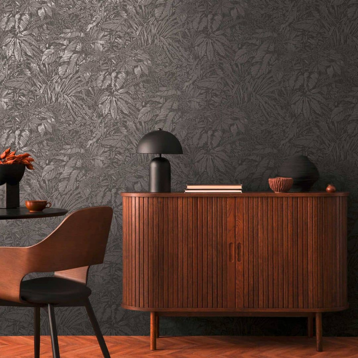 Monochrome Blatt-Tapete in Grau - Vliestapete mit botanischem Design
