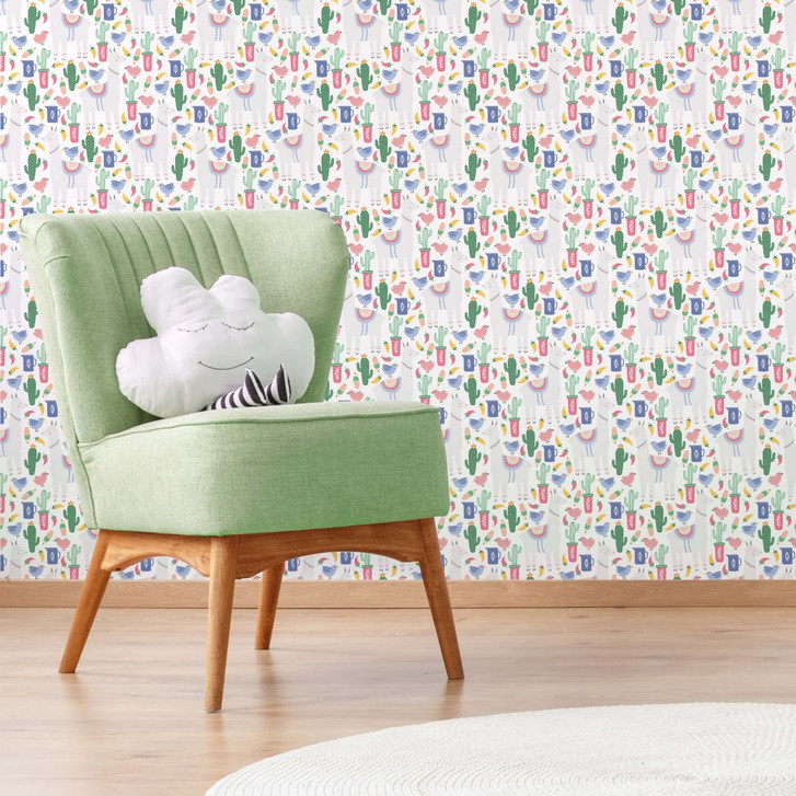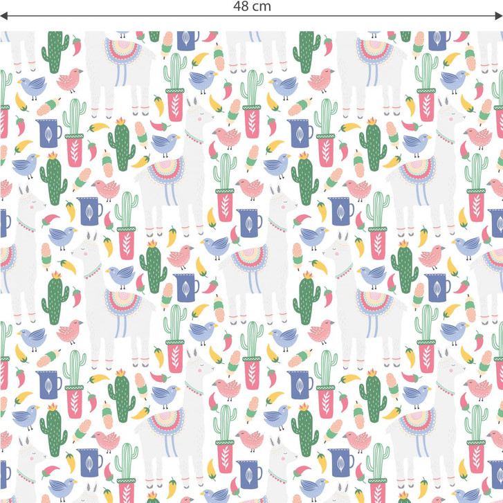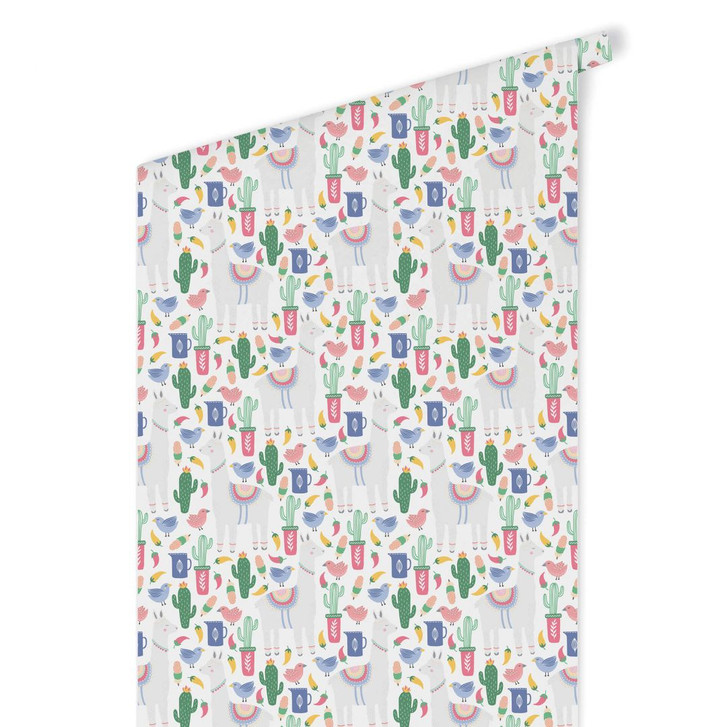 Die Lamas sind los! Eine Vielzahl von Elementen typisch südamerikanischer Wandmalereien auf dieser Mustertapete sorgen für neue Möglichkeiten der Wandgestaltung. Hol dir den Charme dieses traditionellen Stils nach Hause. Im Kinderzimmer, im Flur oder wo auch immer du willst, sorgen liebenswerte Lamas, fröhliche Vögel, kultivierte Kakteen und scharfe Chilis für ein angenehmes Anden-Ambiente.