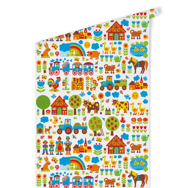 Bauernhoftiere faszinieren vor allem kleine Kinder, denn sie sind zum Anfassen und Streicheln geeignet und machen lustige Geräusche. Die Kuh muht, der Hahn kräht und die Enten quaken den ganzen Tag! Entdecke noch mehr Elemente vom Bauernhof und bringe mit der farbenfrohen Tapete Kinderaugen zum Leuchten!