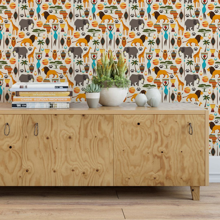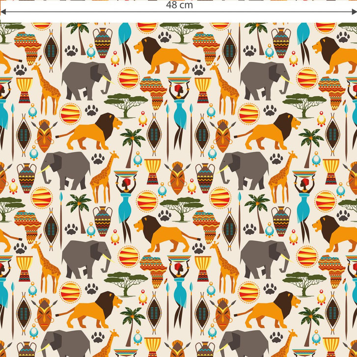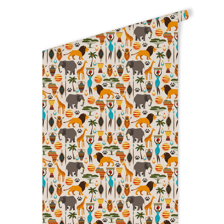Typisch für Afrika sind die farbenfrohen Elemente: Giraffen, Löwen, Affenbrotbäume, Trommeln und Schmuck. Suchst du noch nach einem Thema für die Gestaltung eines Raumes? Wie wäre es mit Afrika? Es gibt viele Möglichkeiten für dekorative Elemente und diese themenspezifische Mustertapete passt gut dazu. Aber auch für Kinderzimmer ist diese farbenfrohe Tapete geeignet.