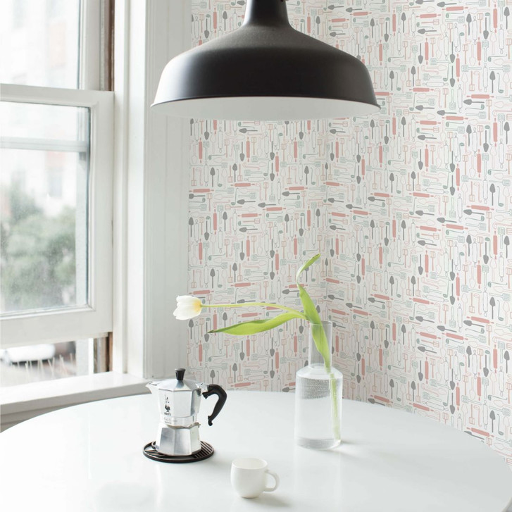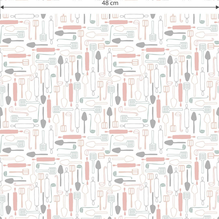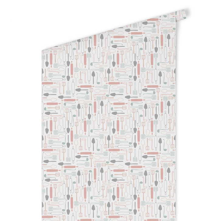 Gestalte deine Küche neu! Die Mustertapete „Cooking Time“ in Rot zeigt die wichtigsten Küchenhelfer: Nudelholz, Pfannenwender, Tortenheber und Schöpflöffel. Die Tapete ist auch in anderen Farben erhältlich.
