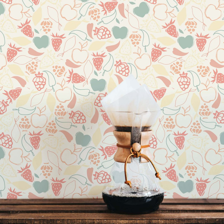 Diese beliebig kombinierbare Mustertapete bringt ganz neue Akzente an die Wand! Verschiedene Obstsorten wie Erdbeeren, Äpfel und Trauben bringen vor allem in der Küche eine farbenfrohe und lebendige Note. Mit dem fruchtigen Motiv kommt Appetit auf!