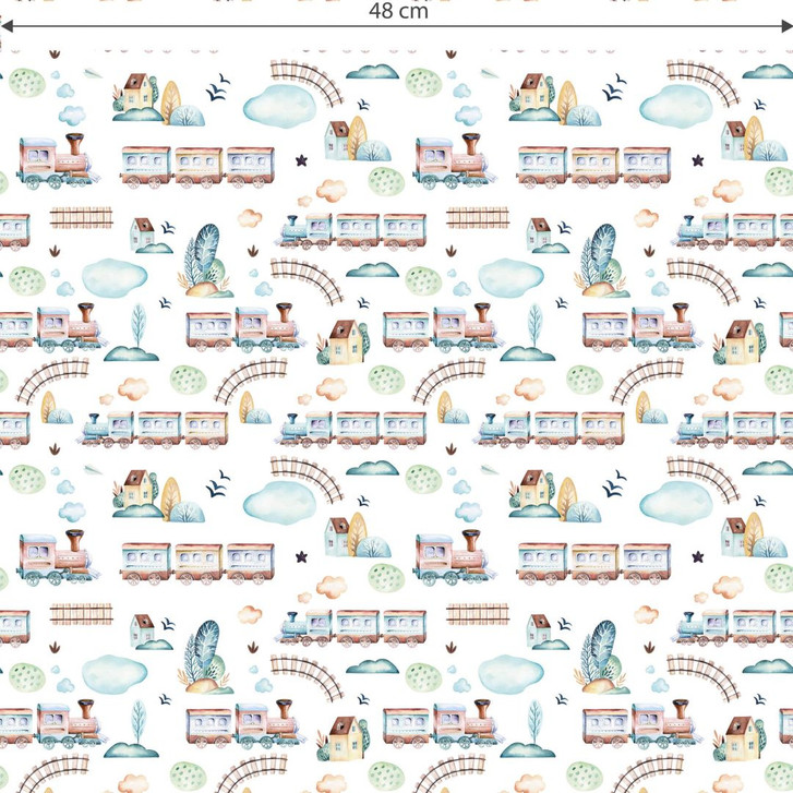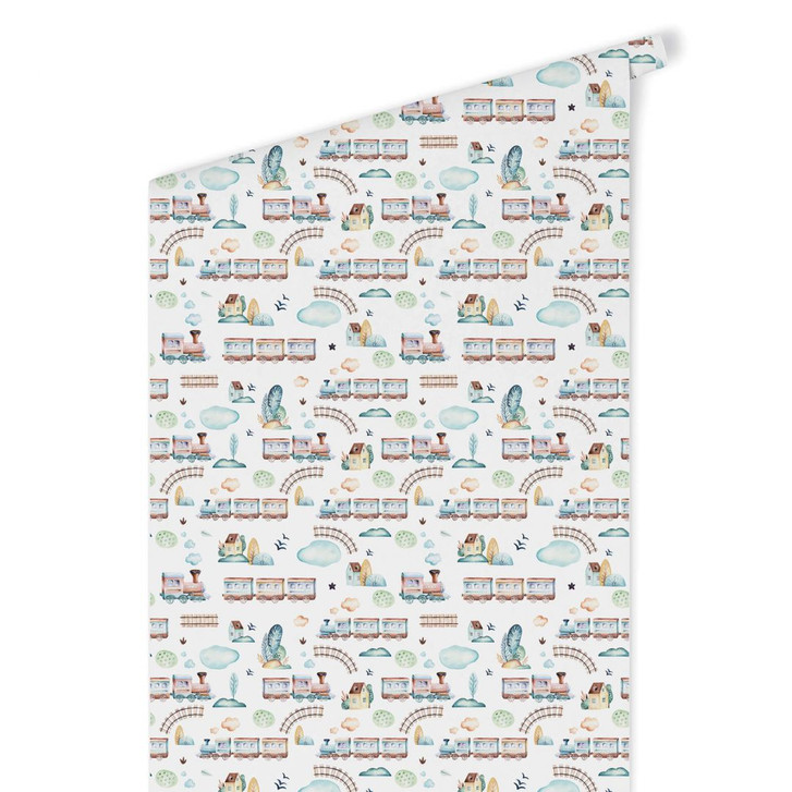 So macht das Tapezieren im Kinderzimmer Spass: Buntes Lokomotiv-Motiv für glückliche Kindergesichter! Mit der gemalten Landschaft der Künstlerin Kristina Kvilis und den kleinen Elementen wie Wolken, Bäumen und Schienen wirkt das Spielzimmer plötzlich spannend und lebendig. Langeweile ade – kreative Kinderzimmerwände willkommen!