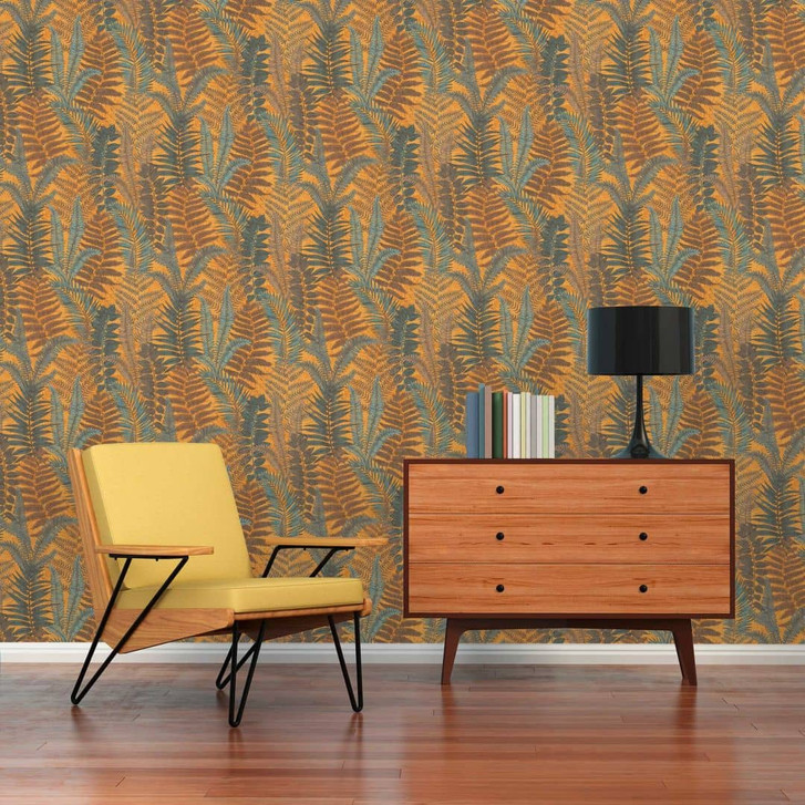 Mustertapete mit Farnblättern Bunt - Florale Tapete Gelb Blau Braun