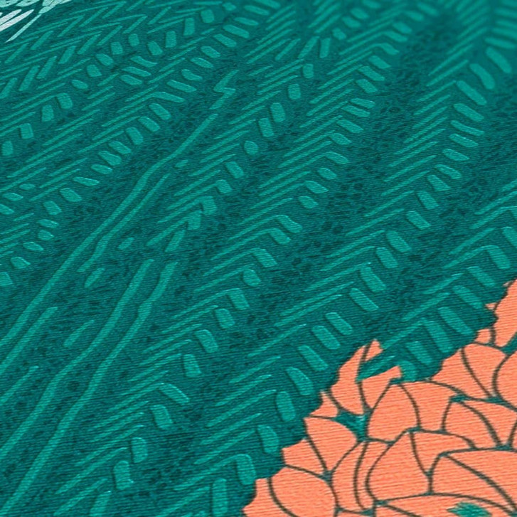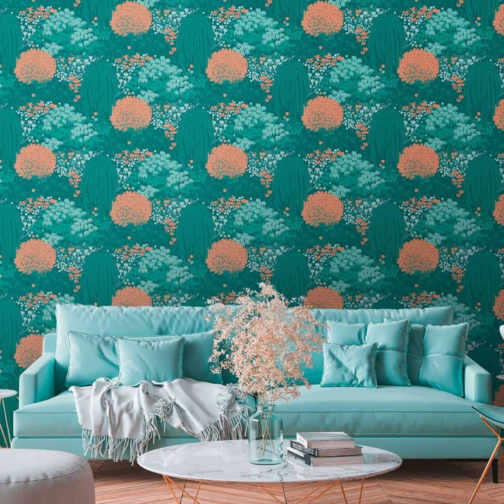 Mustertapete mit Wald-Muster Blau Grün - Tapete mit Akzenten in Orange