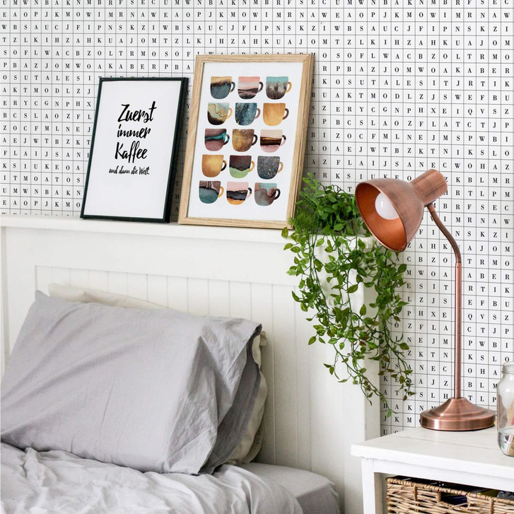 Mit dieser Mustertapete mit zufälligen Buchstaben in Form eines Puzzles erhältst du eine moderne und schlichte Wandgestaltung in deinem Zuhause. Das Motiv ist dezent in schwarz-weiss gestaltet und kann in jedem Raum verwendet werden.
