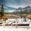 Diese Fototapete bringt die erhabene Schönheit einer unberührten Berglandschaft direkt in Ihr Zuhause. Der ruhige See im Vordergrund spiegelt die goldenen Farben der Herbstvegetation wider, während die schneebedeckten Gipfel im Hintergrund majestätisch emporragen. Der Himmel mit seinen sanften Wolkenformationen unterstreicht die Weite und Klarheit dieser beeindruckenden Szenerie.