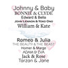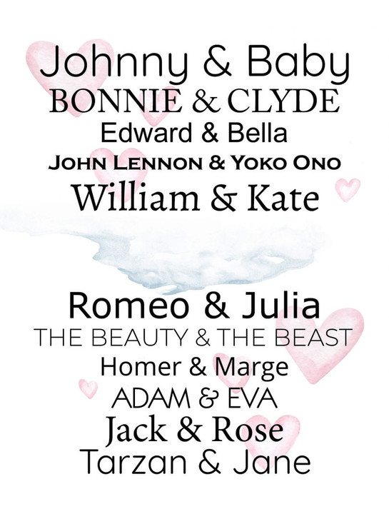 Eine harmonische Wandgestaltung ist wichtig für euer Wohlbefinden in den eigenen vier Wänden. Weisse Wände wirken oft kahl und langweilig. Mit unserer Auswahl an Bildern und Dekoelementen könnt ihr eurer Kreativität freien Lauf lassen. Dieses Poster mit einem Text deiner Wahl eignet sich dafür besonders gut, denn du kannst es ganz nach deinen Wünschen gestalten. Reih dich ein in die lange Liste berühmter Paare.