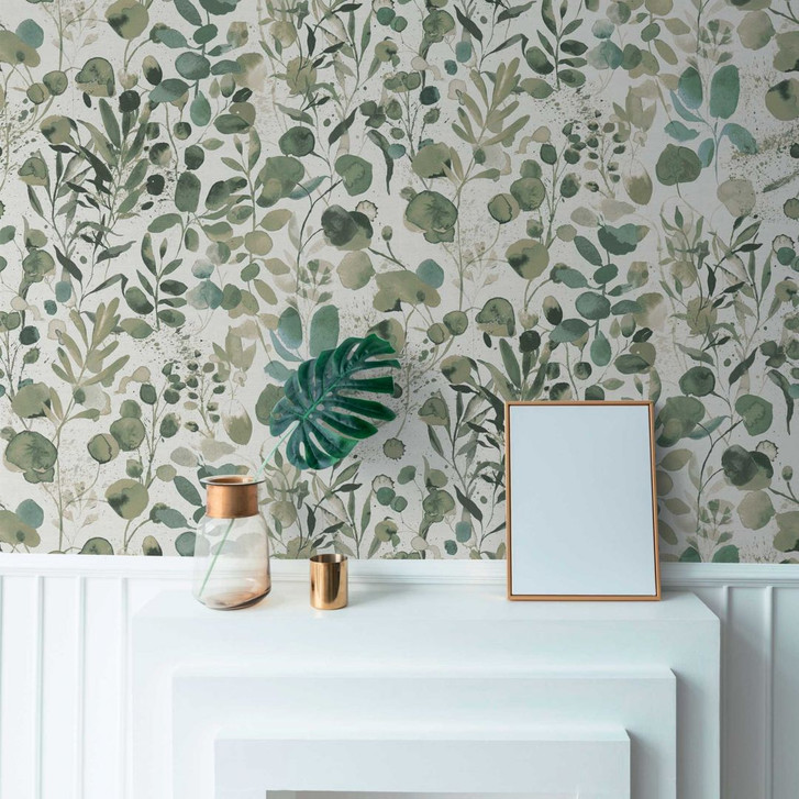 Pintwalls II - Moderne Vliestapete mit aquarellierten Blättern in Grün und Weiß für eine natürliche und stilvolle Wandgestaltung.