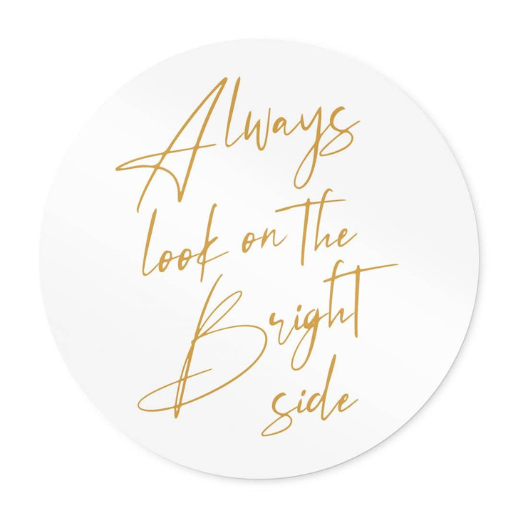 Verleihe deinem Zuhause oder Arbeitsplatz mit diesem eleganten runden Poster eine besondere Atmosphäre, das dich jeden Tag an die Kraft des Positiven erinnert. „Always look on the bright side“ – eine einfache, aber kraftvolle Botschaft, kunstvoll inszeniert in geschwungener, goldfarbener Schrift auf hellem Hintergrund. Das minimalistische und zugleich ausdrucksstarke Design passt mühelos in jedes Interieur und verleiht ihm eine stilvolle Note.